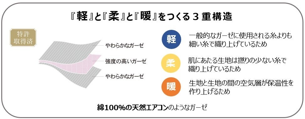 マシュマロガーゼは、UCHINOがタオルの製造技術を最大限にいかして開発した、まるで天然エアコンのような綿100%の特許素材です。通気性、保温性、吸湿・吸水性をバランスよく兼ね備えているマシュマロガーゼは、機能性はもちろんのこと、肌触りの良さも評価され、国内外の10か国で特許を取得しています。マシュマロガーゼを用いた製品は、国内の百貨店、シンガポール高島屋やフランスの老舗高級百貨店「ル・ボン・マルシェ」など海外でも展開され、国内外で高い評価を得ています。