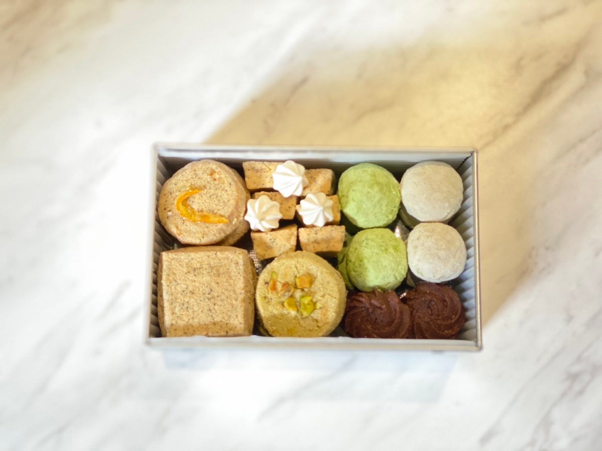 内容量:アールグレイクッキー、チョコクッキー、ピスタチオクッキー、抹茶ブールドネージュ、ほうじ茶ブールドネージュ 各4個、チャイ&オレンジクッキー5個、レモンティークッキー6個、ミントアールグレイメレンゲ3個