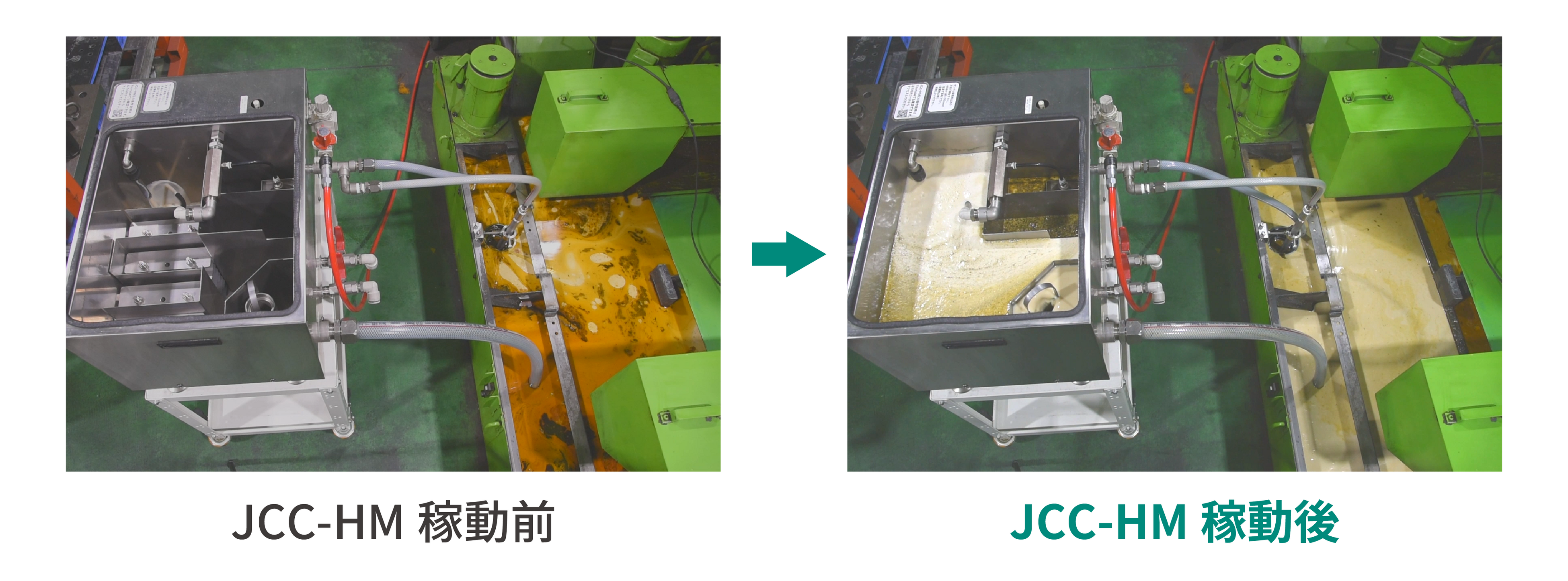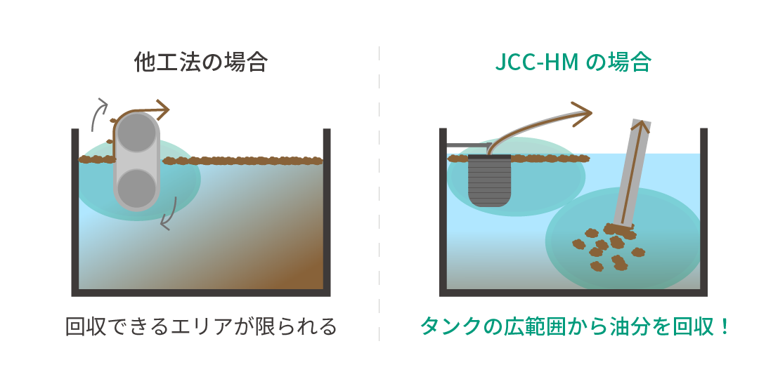 「JCC-HM」は、マイクロバブルを用いて液中の油分を浮上させて除去する装置です。オプションの「浮上油回収ユニット」は、JCC-HMに取り付けることで、液面に浮上している油分を効率良く回収できる装置です。このオプションを使うことで液面と液中の両方から同時に油分を回収できるため、かつてない高効率な油分除去を実現しています。