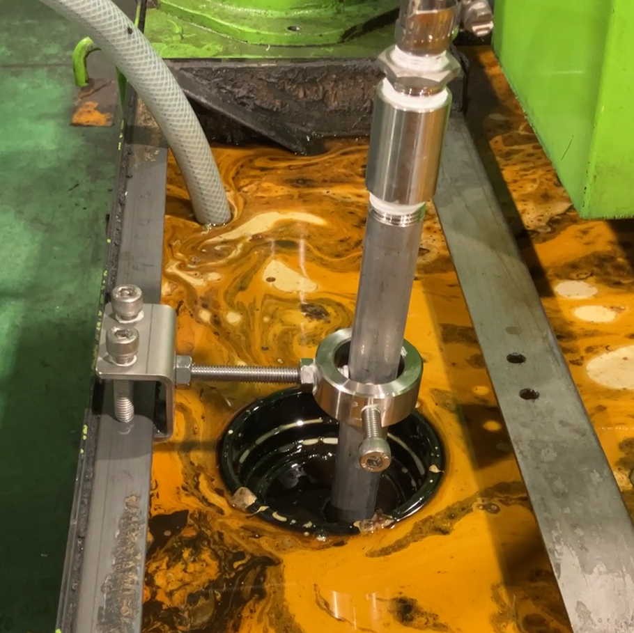 マイクロバブルの力で液中の油分を除去する浄化装置「JCC-HM」に取り付ける、浮上油を回収するユニットです。切削油や洗浄液に混入した油分は液面に浮上して溜まりやすいため、浮上油回収ユニットを液面に設置することで、液面の油分を効率良く吸い込んで回収できます。液中・液面の両方から同時に油分を回収できる画期的なユニットとして、2021年の発売以降、多くのお客様にご活用いただいています。