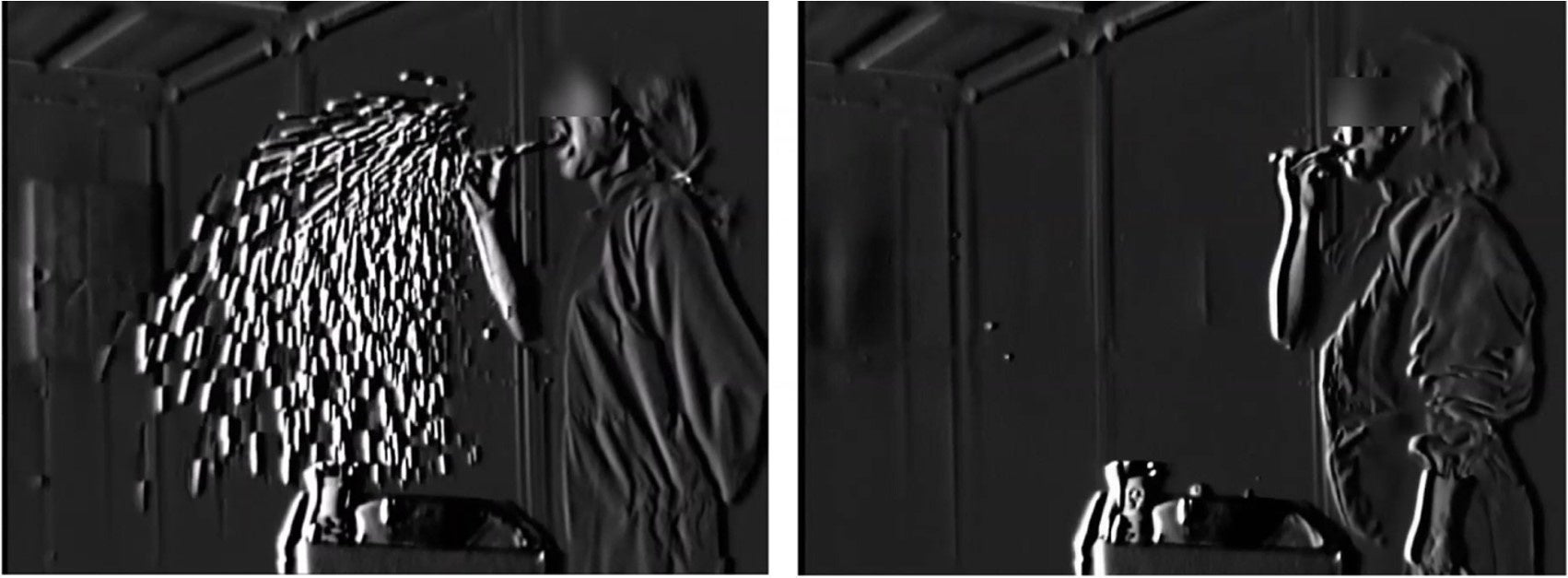 成人男女20名に普段と同じように歯みがきをしてもらい、その様子を微粒子可視化装置で撮影し(図1)、得られた画像から飛沫の量と飛距離の解析を行ないました※1。