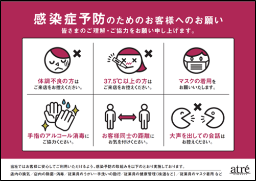 アトレでは、お客様、従業員及び関係者の皆様の安全性を考慮し、新型コロナウイルス感染拡大防止の為の対策を講じております。また、来店されるお客様へのご協力をお願いしております。
