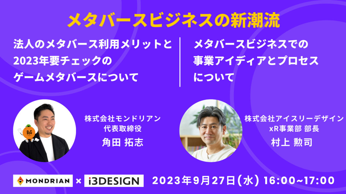 【9/27(水)16時から開催】「メタバース」をテーマにオンラインセミナーを開催。株式会社モンドリアン 代表取締役 角田氏と株式会社アイスリーデザイン xR事業部 部長 村上が登壇。