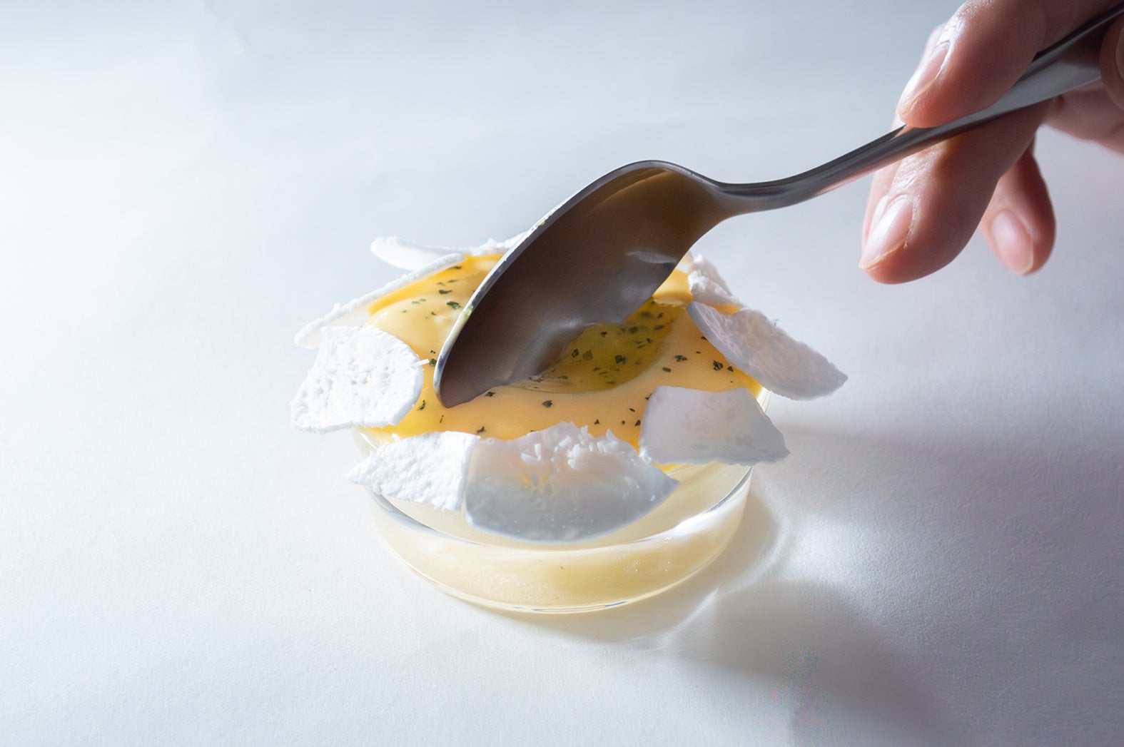 苺と金柑をメインとして複数の味を構成しました。食べ進めると、1つになっていく味わいと変化していく香り。また、様々な食感と温度差を楽しんでいただければと思います。