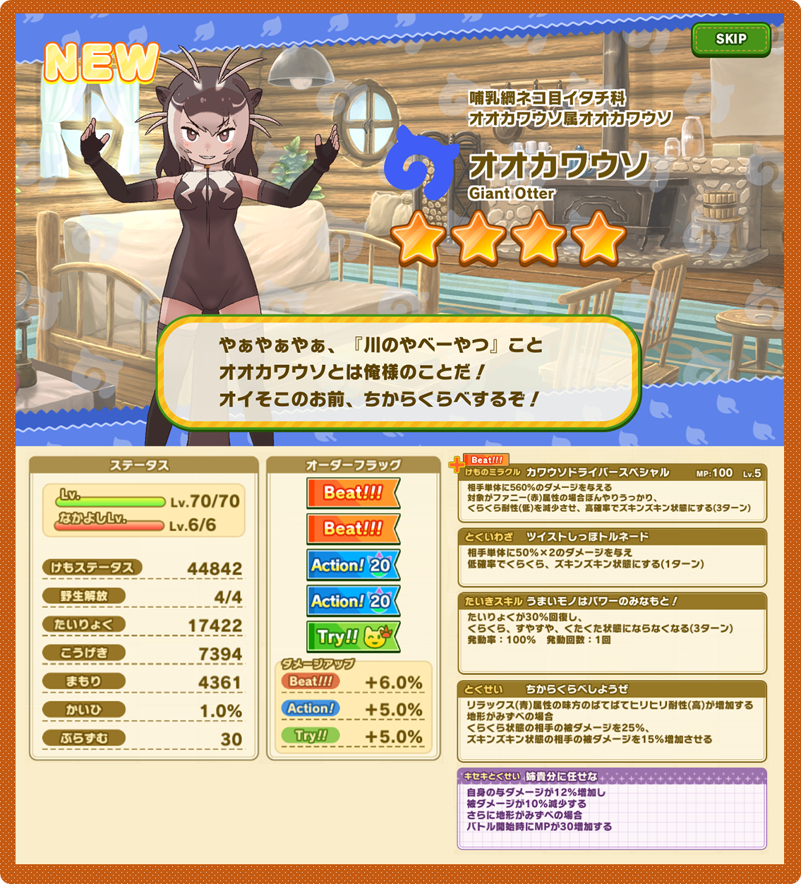 なお、☆4「オオカワウソ」は、開催中のイベント「ジャパリパーク立ち入り禁止区域・解除開始」にてステータスアップの特効を持っています。