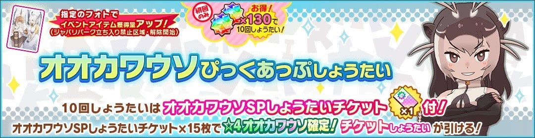 新フレンズ☆4「オオカワウソ」の出現確率がアップする「オオカワウソぴっくあっぷしょうたい」を開催します。