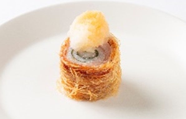 中東で食されている麺の1種であるカダイフで包んだ豚バラと大葉を、香ばしく揚げた贅沢な一品。