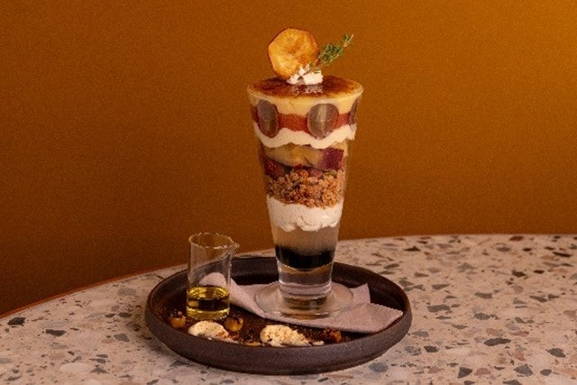 さつまいもブリュレのやさしい甘さに、自家製りんごジャムとぶどうの酸味でアクセントを添えた、秋限定のパフェ。
