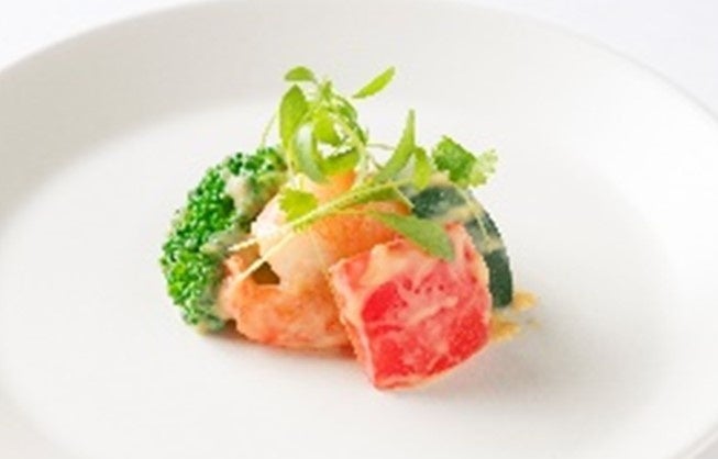 彩り野菜と海老をねりごまの深み感じる酢味噌で。パクチーの香りが爽やかさを添えます。