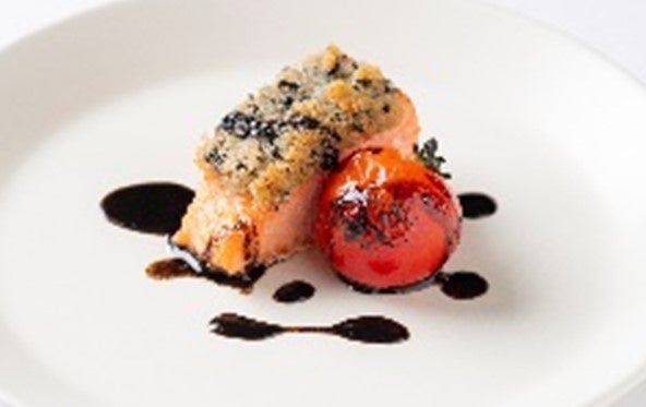 ごまで仕立てたクラストをサーモンにのせ、香ばしく焼き上げました。まろやかな酸味の黒ごまバルサミコソースとともに。