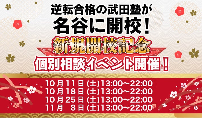 学習塾「武田塾」を全国に展開している株式会社A.ver(本社:東京都文京区 以下「武田塾」)は、10月11日、兵庫県神戸市に武田塾名谷校を開校することをお知らせいたします。武田塾名谷校の開校を記念して、名谷校では個別相談イベントを実施いたします。開催予定は以下の通りです。10月11日(土) 13:00~22:0010月18日(土) 13:00~22:0010月25日(土) 13:00~22:0011月8日(土) 13:00~22:00
