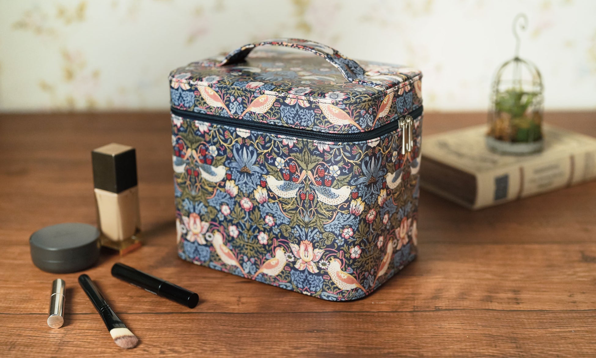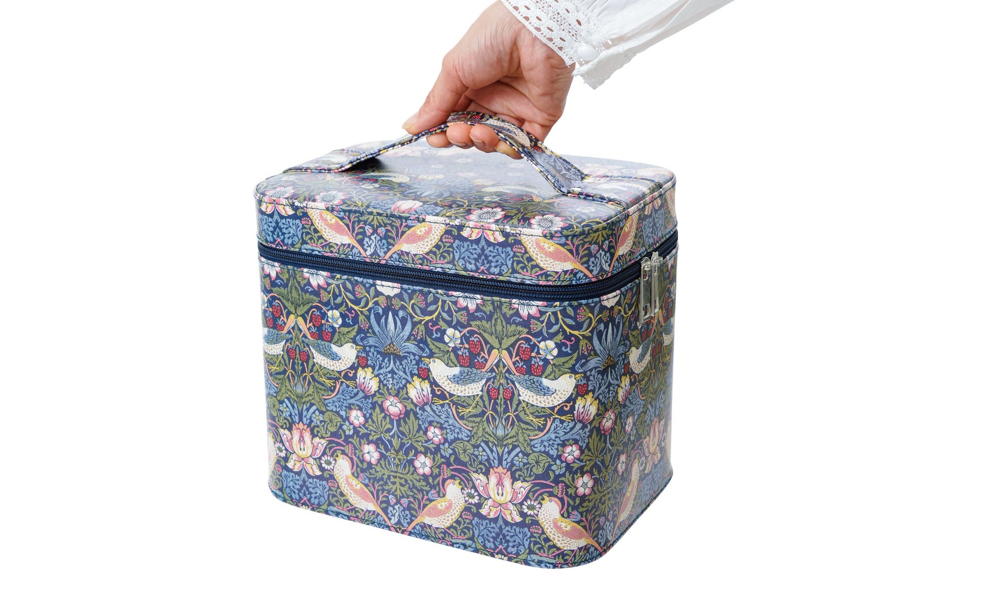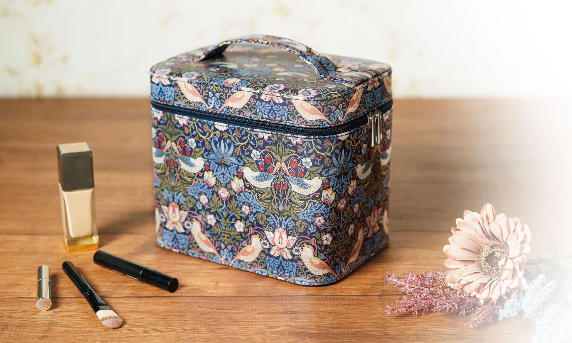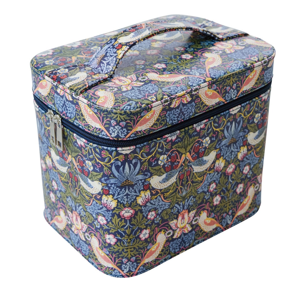ウィリアム・モリスの「いちご泥棒」を全面にあしらった、オシャレなデザインの大容量メイクボックス