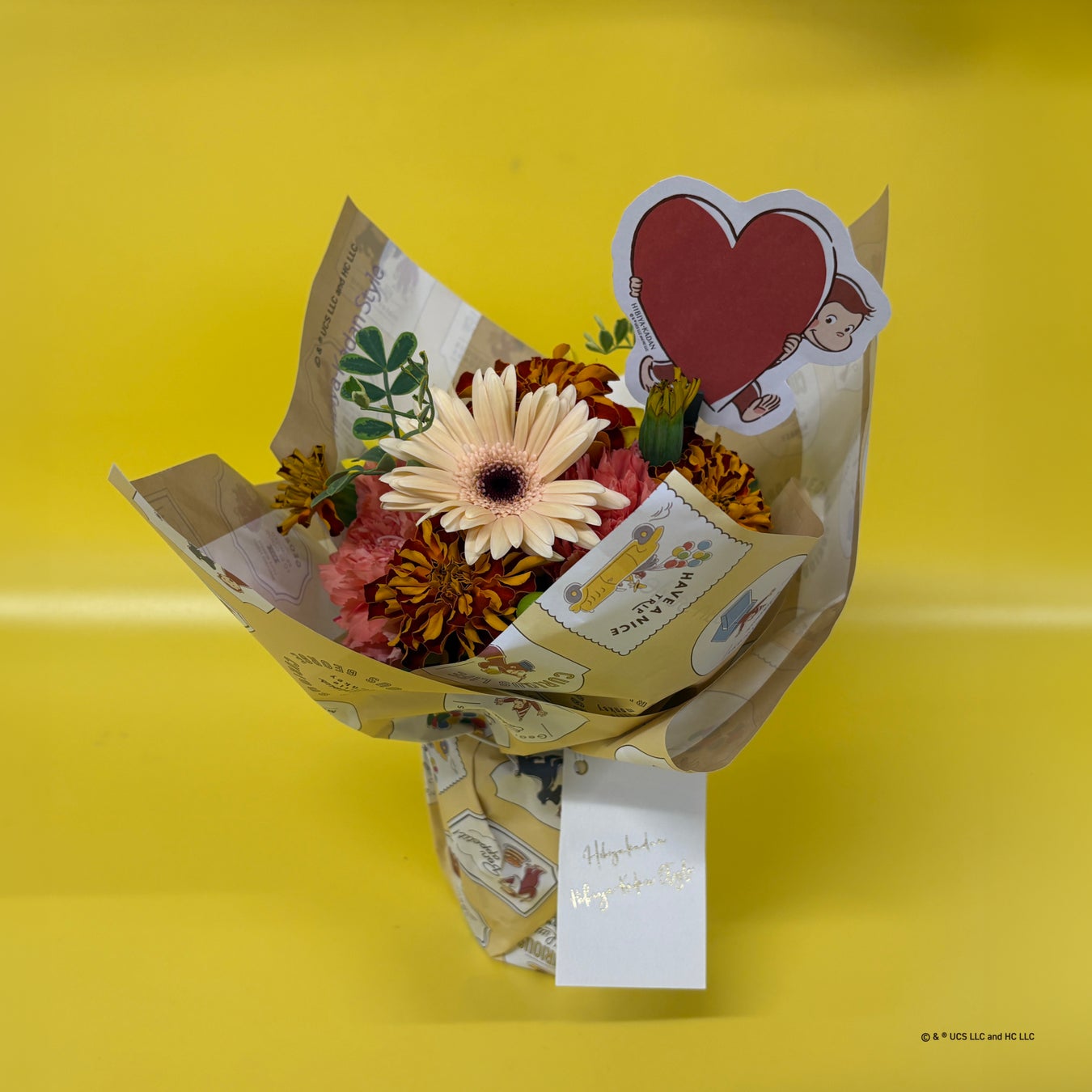 ジョージと黄色い帽子のおじさんを象徴するイエロー&ブラウンに合う、深まる秋の移ろいを感じられる季節の花をたっぷりと束ね、大きなハートを抱く姿が愛らしいジョージが描かれたラッピングで包んだブーケは、家族への温かな贈り物や自分を癒すご褒美としておすすめです。