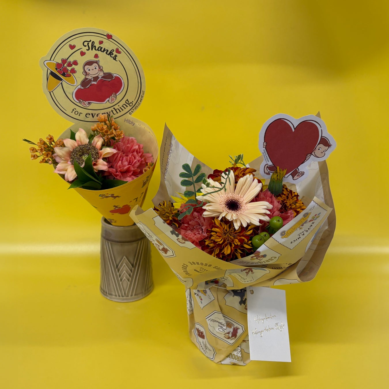 今回、店頭で販売するアイテムラインアップは、カジュアルに花のある暮らしを楽しめるミニブーケ『おさるのジョージ/パピエブーケ』と、そのまま置いて飾れる花束『おさるのジョージ/シュシュフルール』の全2種です。