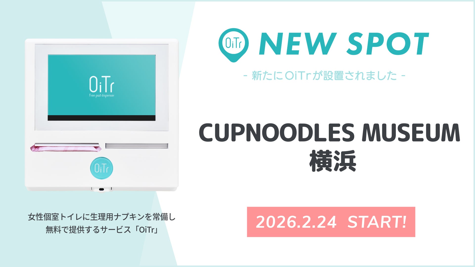 全国の商業施設や交通機関、公共施設、オフィス、学校などの女性個室トイレに、生理用ナプキンを常備し、無料で提供する日本初*¹のサービス「OiTr(オイテル)」を展開するオイテル株式会社(本社:東京都新宿区、代表取締役:﨑山 真)は、「トイレットペーパーのように、個室トイレに生理用品が行き届く社会」の実現を目指し、新たに「カップヌードルミュージアム 横浜(神奈川県横浜市)」の従業員用の女性個室トイレにOiTrを設置し、2026年2月24日(火)よりサービスを開始いたしたことをお知らせいたします。本取り組みを通じて、従業員の皆さまが安心して働ける環境づくりを支援してまいります。