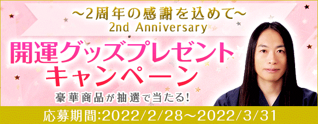 テレシスネットワーク株式会社(本社:東京都港区、代表取締役:鷹石惠充 https://www.telsys.co.jp/)は、2022年2月28日(月)より、月額公式サイト『ラブちゃん占い』にて、『ラブちゃん占い2周年の感謝を込めて 開運グッズプレゼントキャンペーン』の提供を開始いたしました。