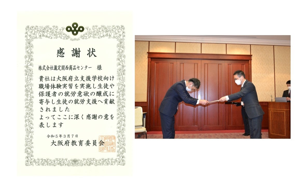 ㈱瀧定関西商品センター、障がい者の方々への職場体験実習に対する感謝状を大阪府教育委員会より受賞