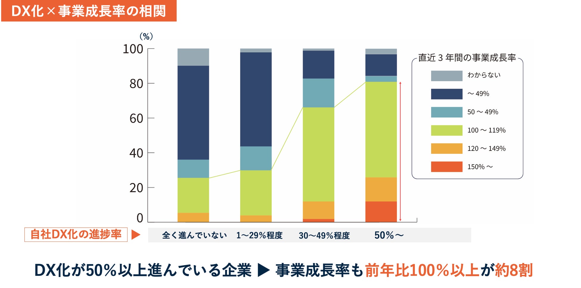 また、DX化が50%以上進んでいる企業は、事業成長率も前年比100%以上が約8割にも達していることも調査結果により分かった。