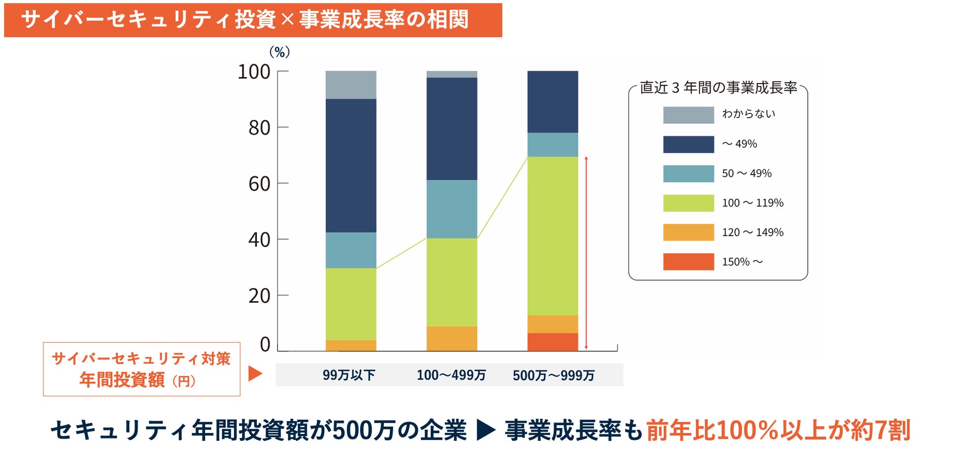 サイバーセキュリティ対策への投資を行っている企業が「事業成長をしているか」、「DX対策が進んでいる企業は、事業成長もしているか」などの相関性について経営者層300名に対して実態調査を行った結果、約7割の企業がサイバーセキュリティ対策に1000万円程度投資を行った結果、前年比事業成長率100%以上を達成していることが判明した。