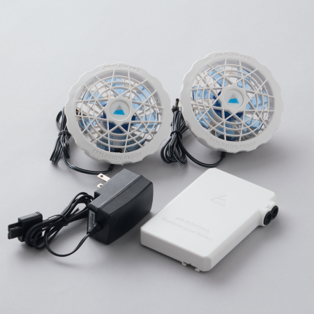 バッテリーユニットは小型かつ約200gと軽量で、重さの負担を軽減しました。1台のバッテリーで2台のファンを同時駆動することが可能。さらに、一度の充電で連続動作時間8時間を実現し、バッテリー切れの心配もありません。