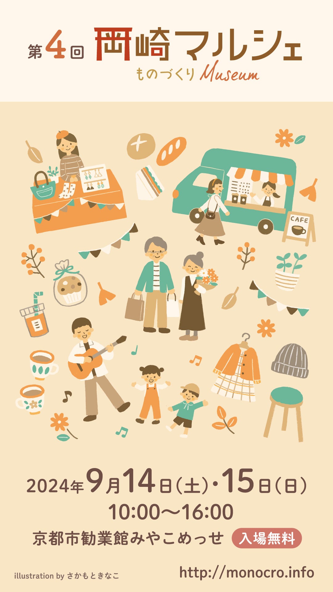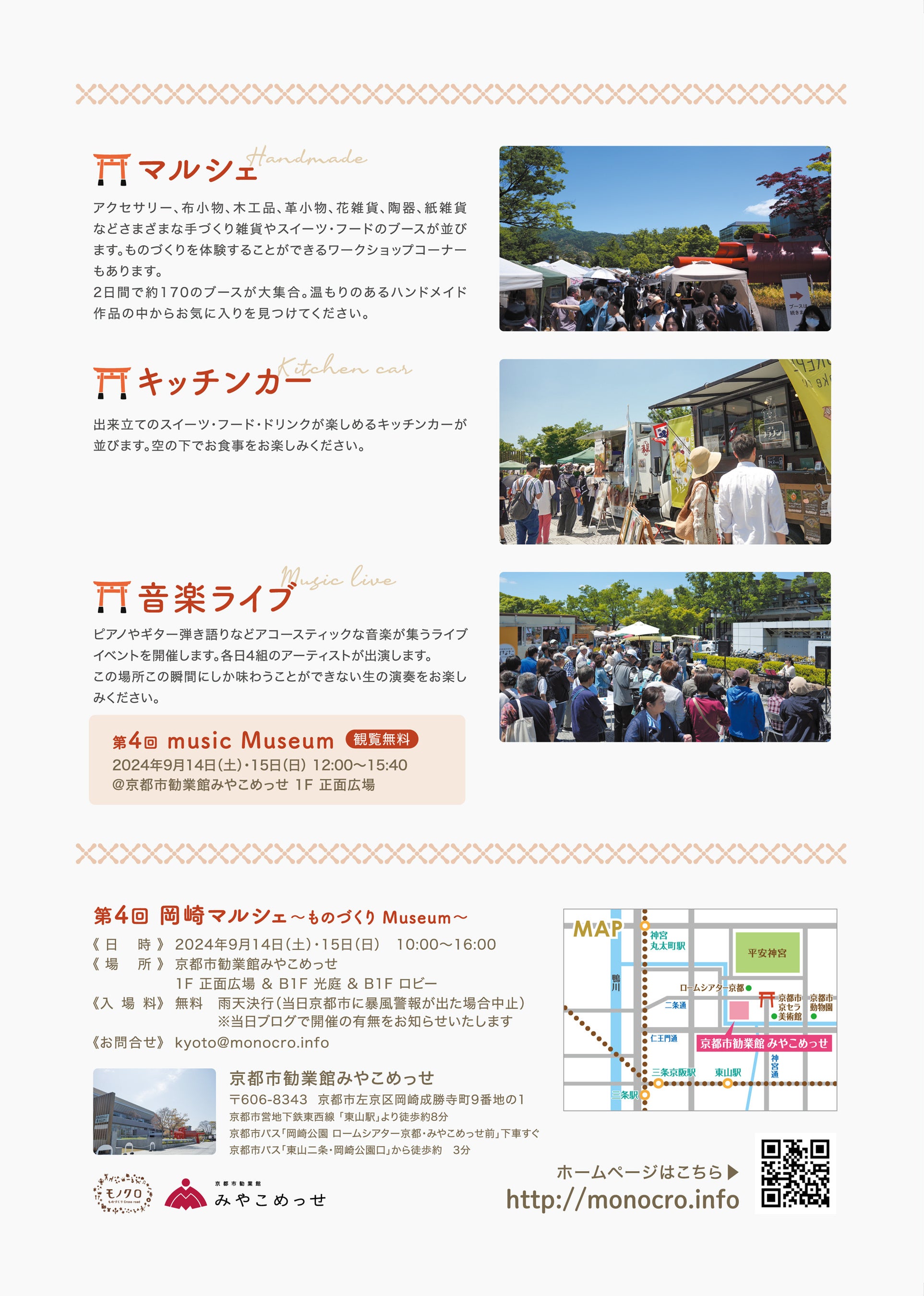 京都市勧業館みやこめっせでは、手づくり雑貨やフードが集まるマルシェイベント「第4回 岡崎マルシェ~ものづくりMuseum~」を、2024年9月14日(土)~15日(日)に開催いたします。