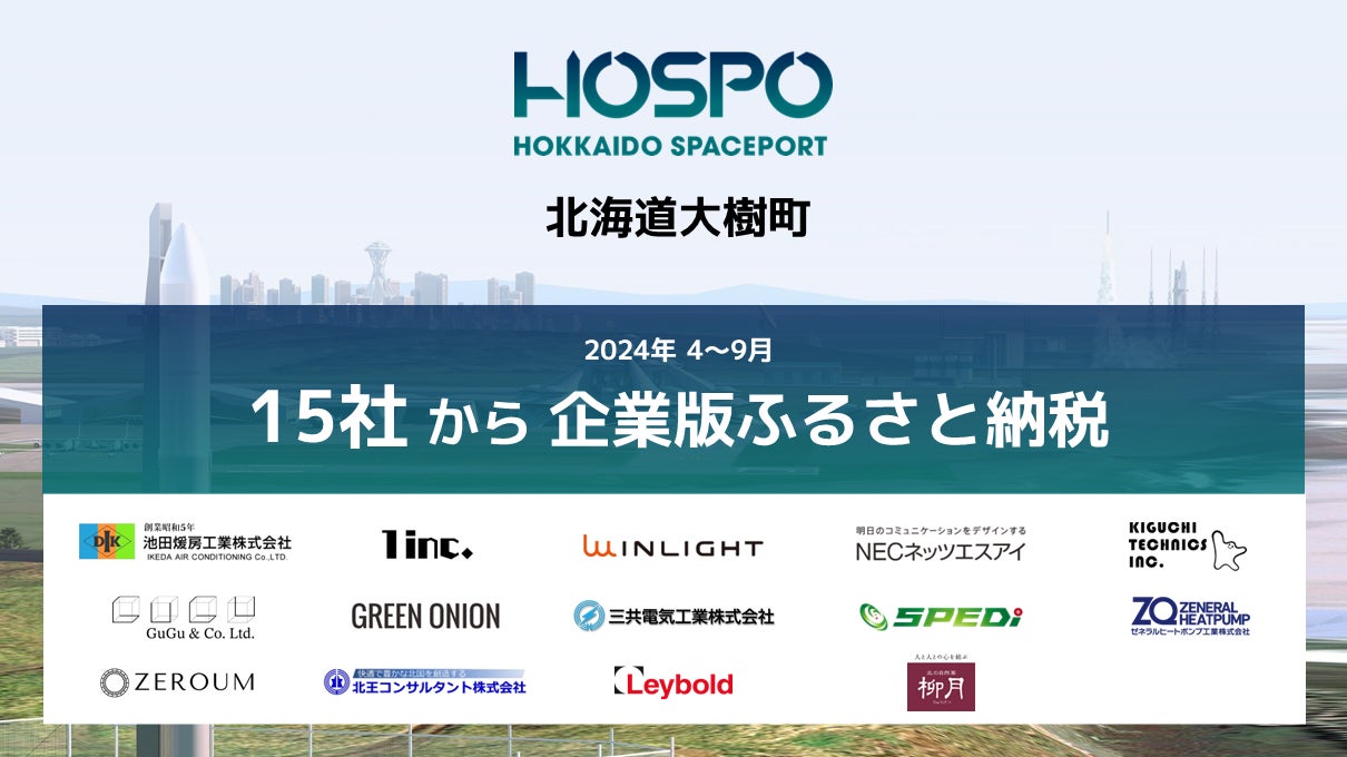 北海道大樹町とSPACE COTAN株式会社は、民間にひらかれた商業宇宙港「北海道スペースポート(以下、HOSPO)」プロジェクトの資金として、2024年4月から9月までの間に、北海道内外の15社から企業版ふるさと納税の寄附をいただいたことをお知らせいたします。