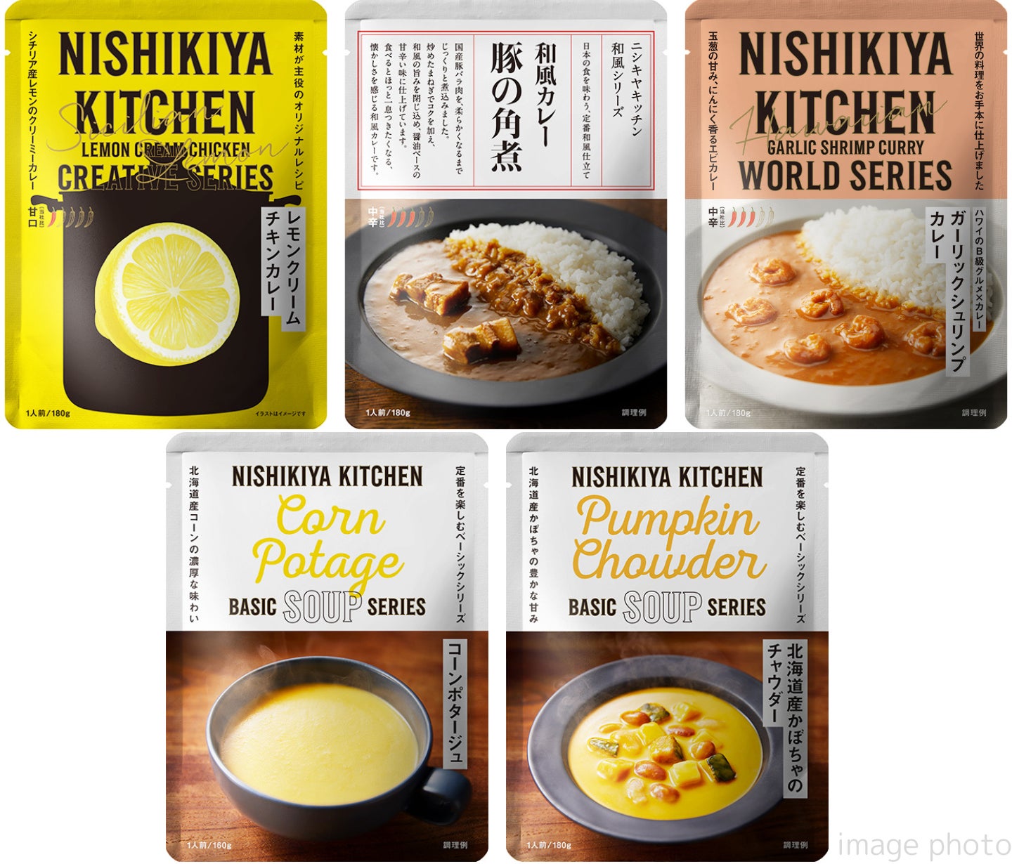 セット内容:レモンクリームチキンカレー・豚の角煮カレー・ガーリックシュリンプカレー・コーンポタージュ・北海道産かぼちゃのチャウダー 各1パック 税込1,800円