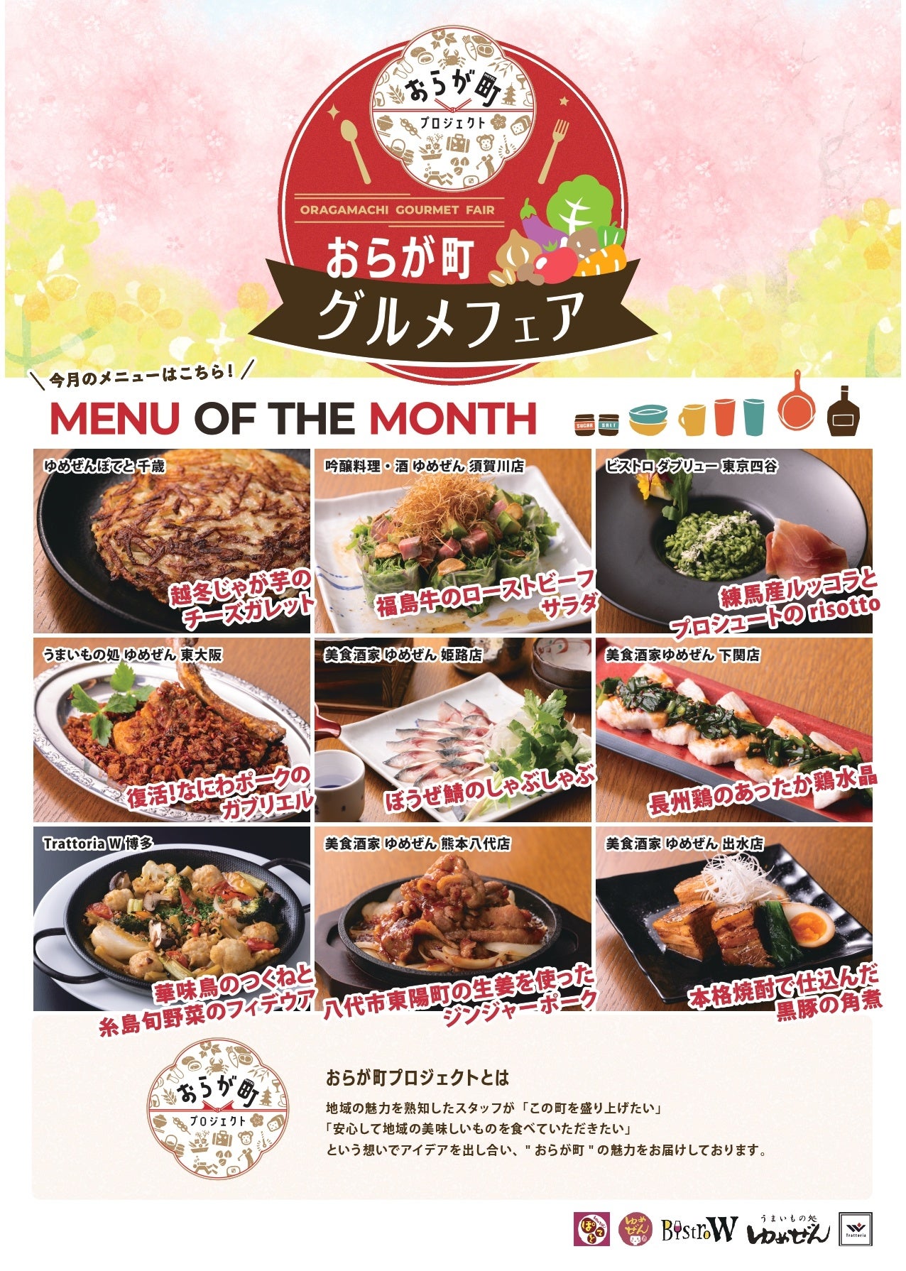このプロジェクトの一環として、食で地域の魅力を発信することを目的に「おらが町グルメフェア」を実施します。全国各地にある直営レストラン・居酒屋9店舗の料理長が工夫を凝らし、季節ごとに新しいメニューが登場します。地域の旬食材をいつもとは違う食べ方で、美味しくアレンジしたメニューでご提供しますので、近隣にお住まいの方も、出張や旅行でホテルにお泊りの方もお楽しみいただけます。