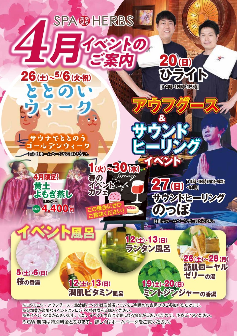 【スパハーブスはイベントが満開!】埼⽟最⼤級のスパリゾート「美楽温泉 SPA-HERBS」が4月イベントを多数開催!