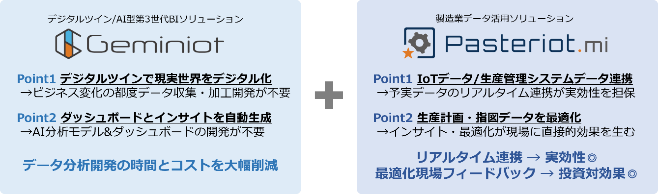 DTSブースでは、AI搭載のビジネス・インテリジェンス(以下、BI)ソリューション「Geminiot(ジェミニオ)」と、製造業向けのインタフェースを追加した「Pasteriot.mi(パステリオ エムアイ)」をご紹介します。Geminiot/Pasteriot.miでは、分析モデルとダッシュボードをAIが自動生成。従来専門家が行っていた領域をAIが担うため、専門知識が無くてもデータ分析が可能となります。さらに、伴走支援チームがデータ活用に関わる環境の整備から分析施策の立案、ツールや機能の技術的な支援まで、お客様の課題に応じて業務改善の成功を後押しします。