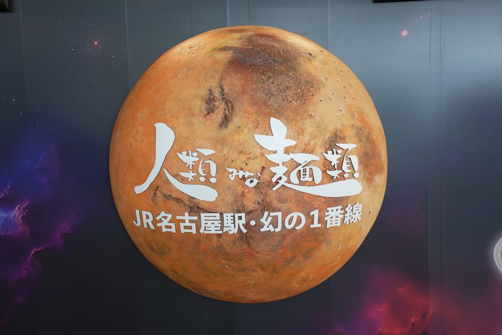「人類みな麺類 JR名古屋駅・幻の1番線」の飲食スペースの壁面には「火星にラーメン屋を一番最初に出店する」ことを目標としているUNCHI株式会社が宇宙船で火星に到着した様子をデザインしたパネルを設置しています。パネルの目玉となる人類みな麺類のロゴ入り火星の造形は、数多くのテーマパークの造形を手がけた「atelier ROJIURA」(代表:南條 充氏)が造作したオブジェで、名古屋駅の名物になってもらいたいうという想いが込められています。