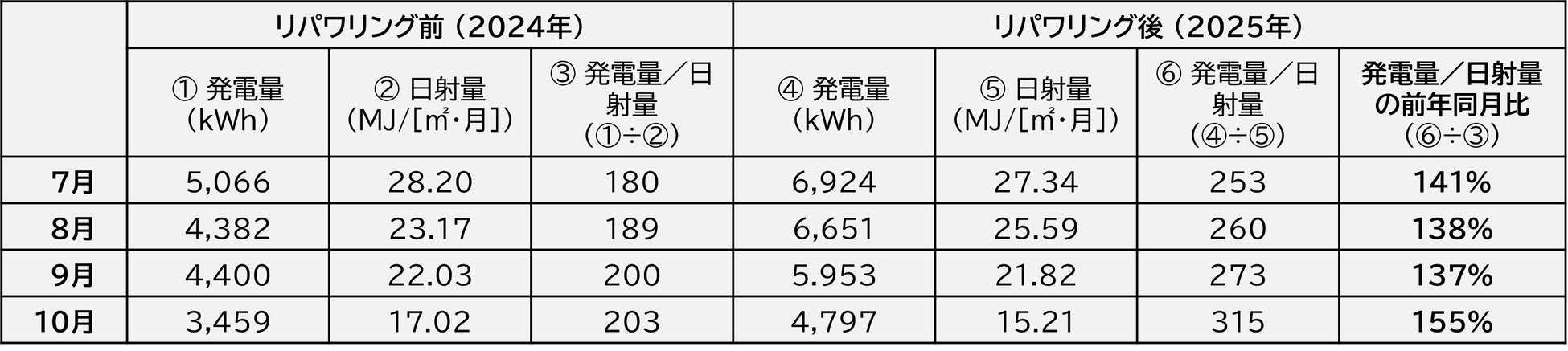 本案件では、既設の太陽光パネルおよびパワーコンディショナの更新を中心としたリパワリングにより、設備容量がほぼ同等(約1,063kW)であるにもかかわらず、リパワリング後の2025年7~10月の発電量は、前年同期比で月別に137~155%となり、大幅な発電量向上を達成しました。