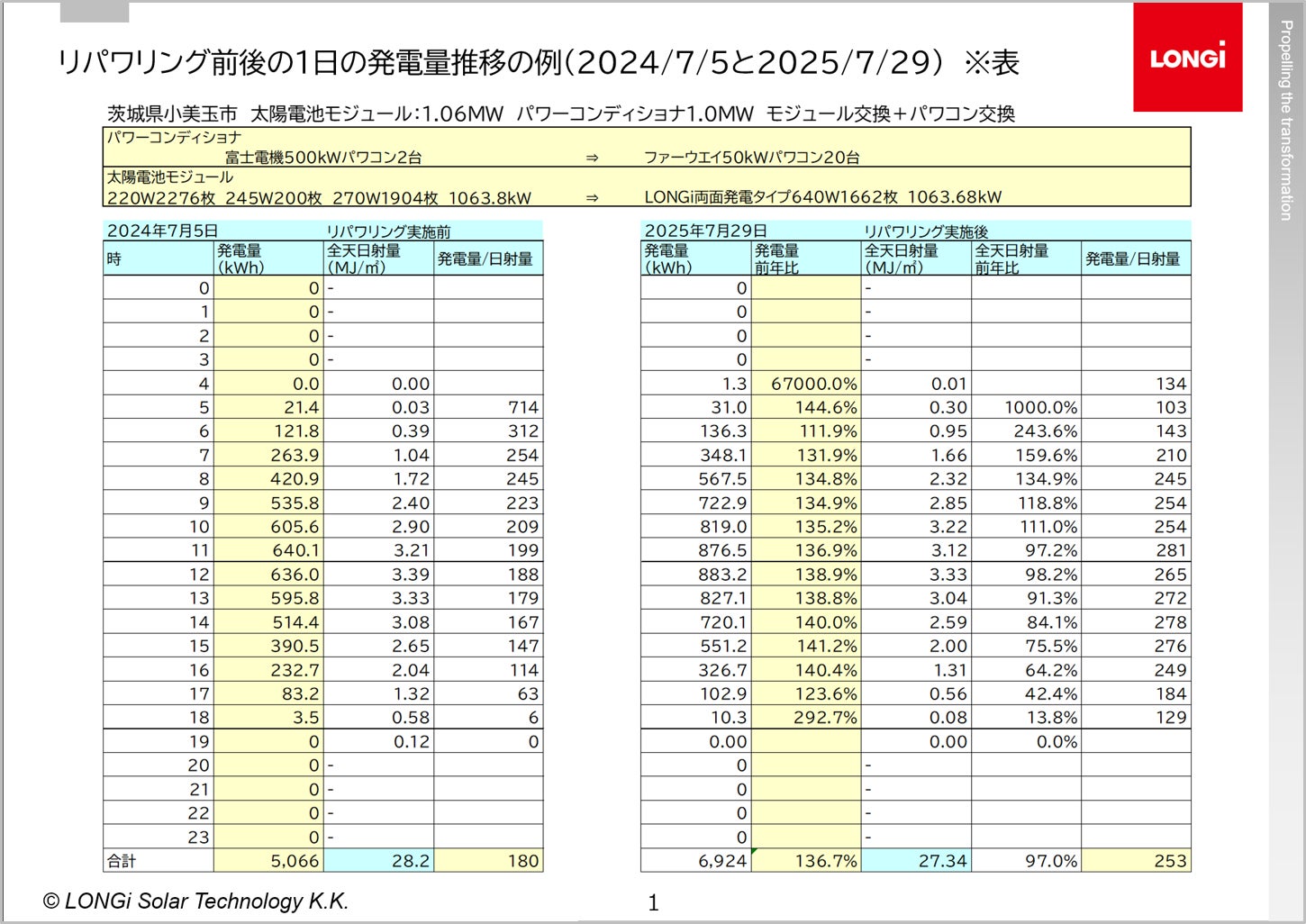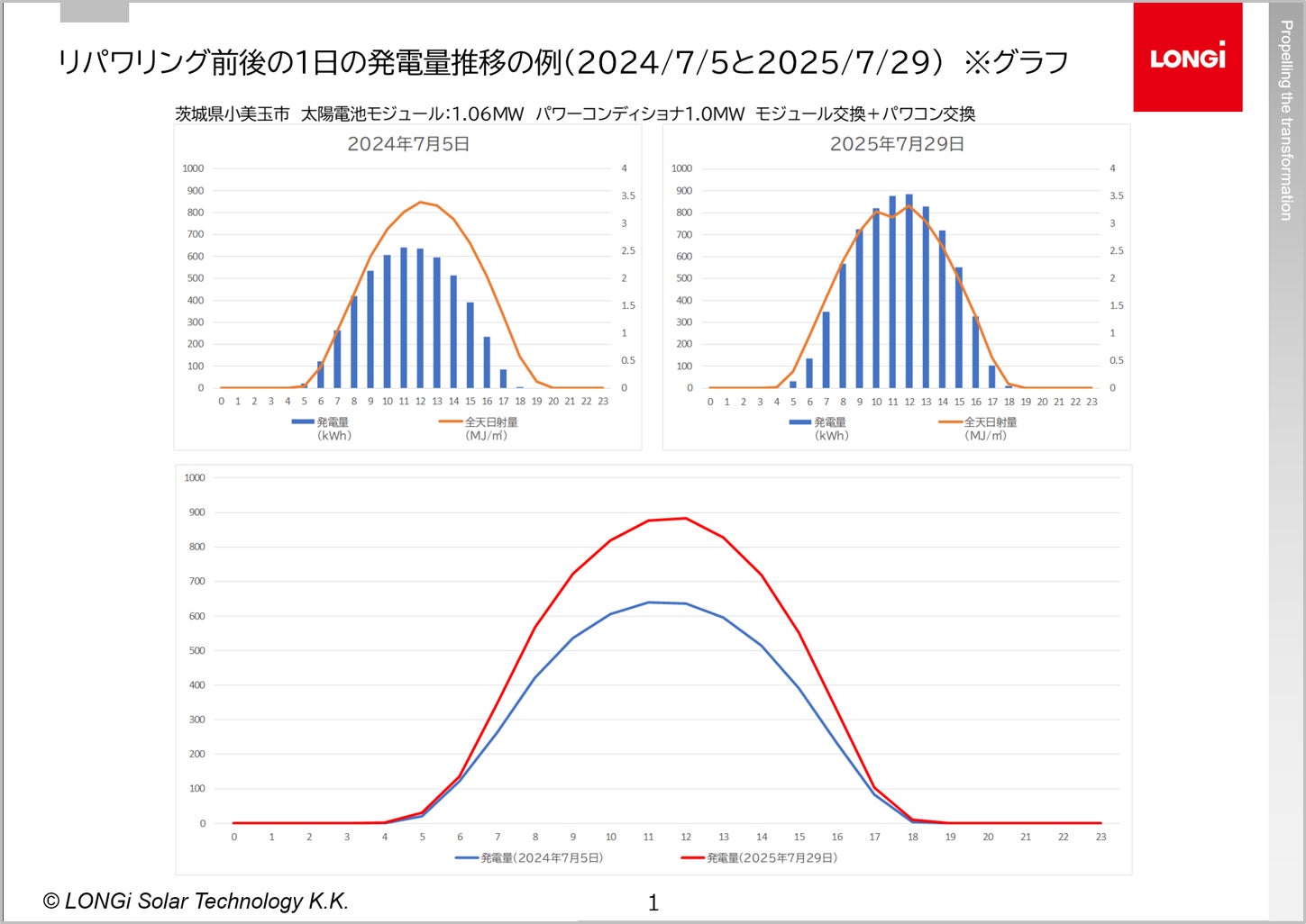 本成果は、経年劣化した設備を更新するリパワリングそのものの効果に加え、高効率・高信頼性を特長とするLONGiのHPBC 2.0搭載太陽光パネル「Hi-MO 9」が、その効果の実現に寄与した結果であり、日本におけるリパワリングの有効性を示す事例となりました。