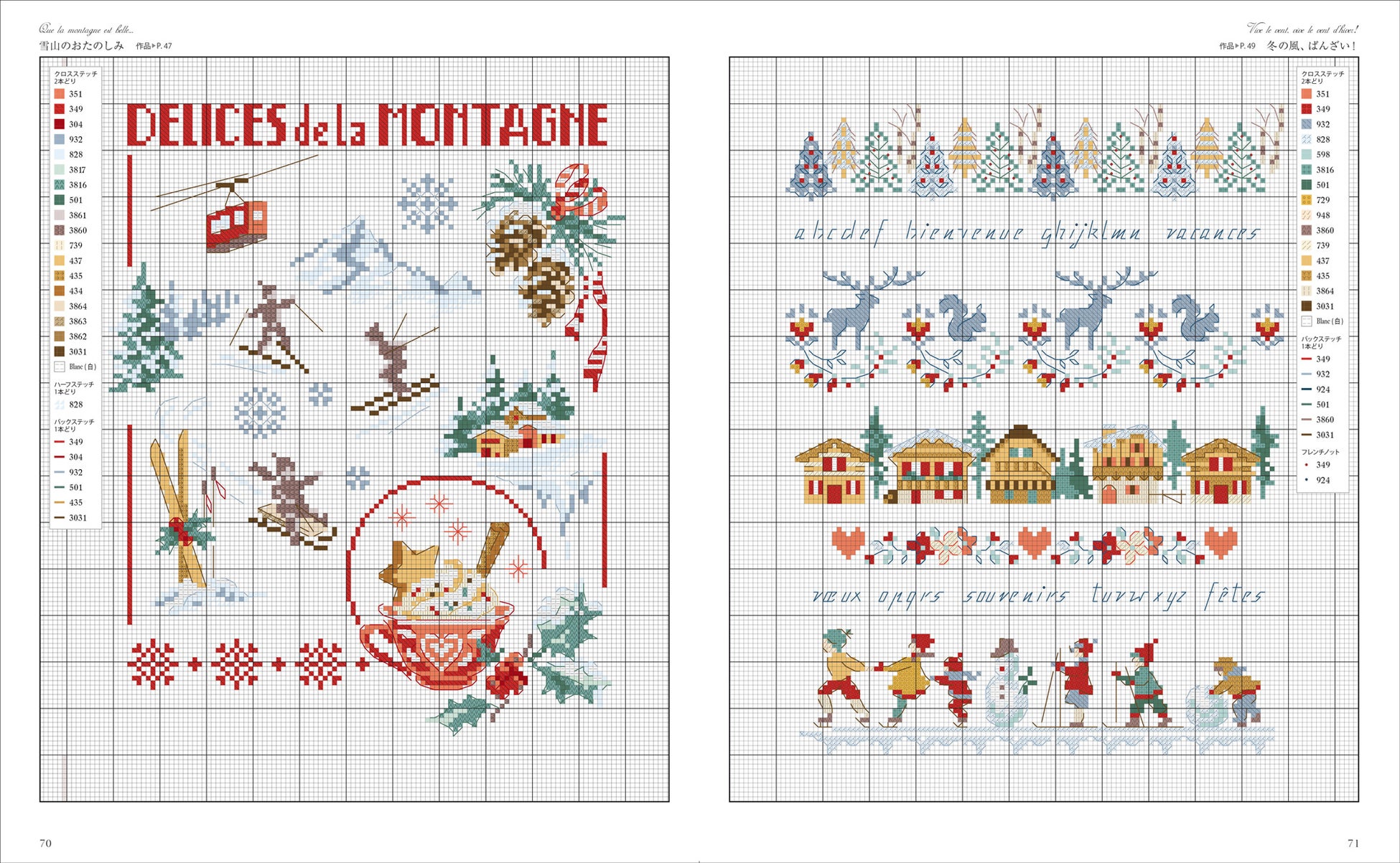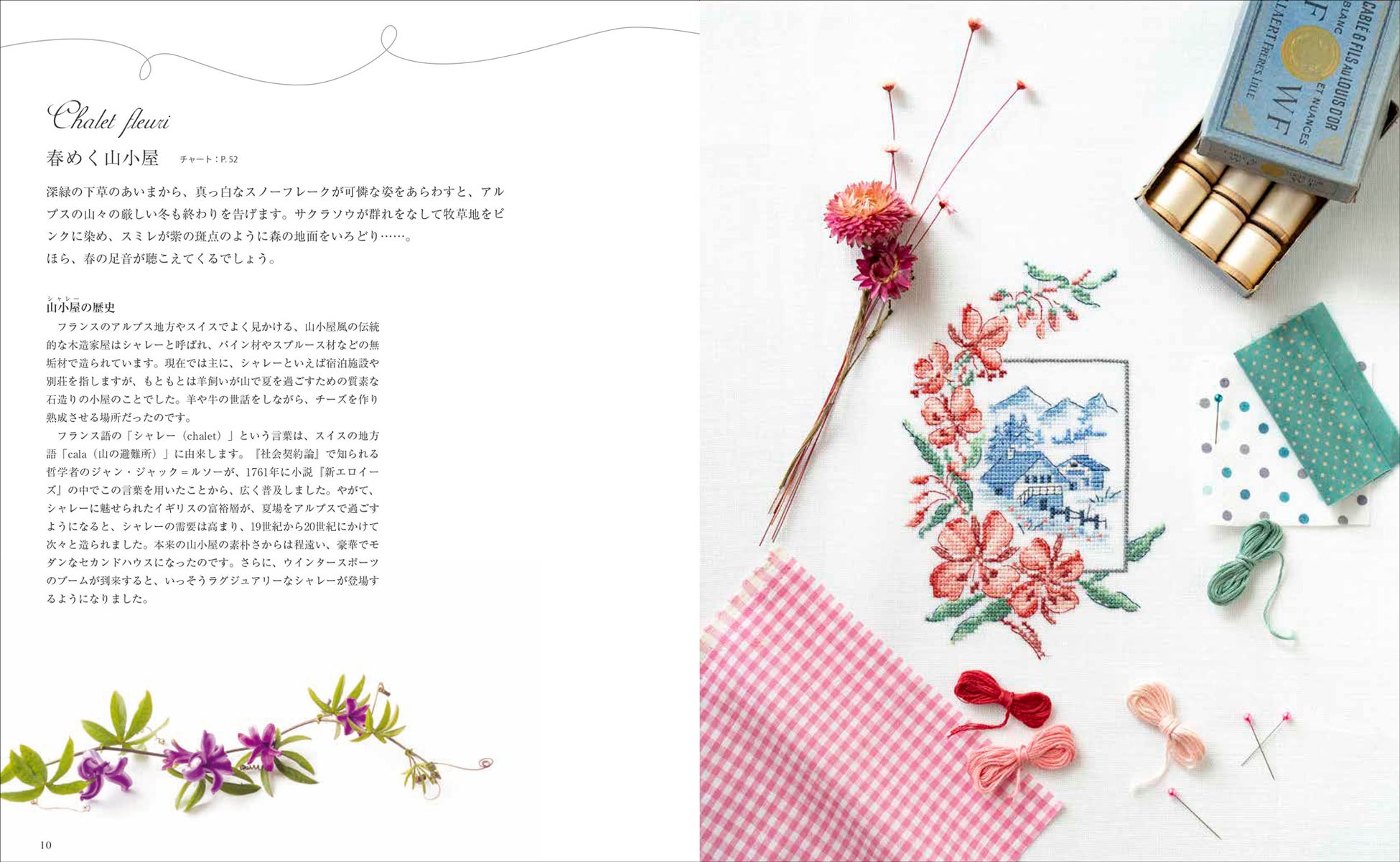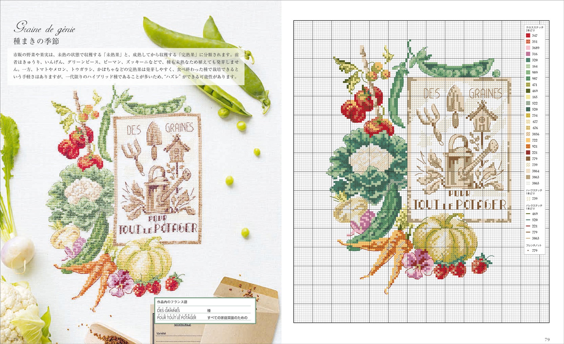 本書は、四季のうつろいにつれて、その表情を変える山の風物詩をテーマにした「クロスステッチでつづる山々の四季」と、自然の営みを豊かに紡ぎ出す「クロスステッチでつづるフランスの野菜と菜園」の2つの章で構成されています。1章は、アルプス山脈やピレネー山脈など、フランスが誇る美しい自然の風景や文化がモチーフ。2章は、ヴェロニク・アンジャンジェの水彩画をもとに図案を起こした、ノスタルジックな野菜図鑑風の仕上がりです。全40図案を収録。巻末には日本語版限定のわかりやすい解説も掲載しています。クロスステッチで、フランスの美しい自然を堪能してください。