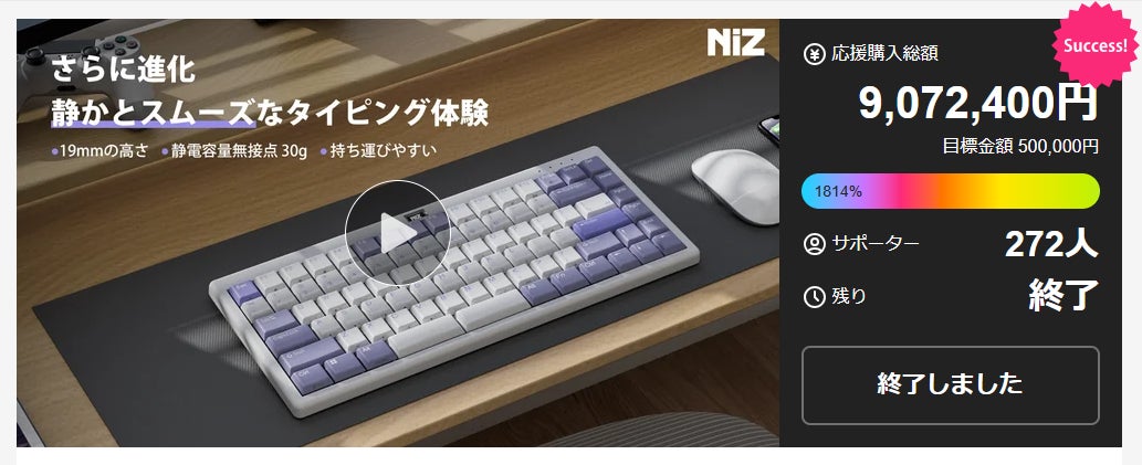 超薄型静電容量無接点キーボード「Lシリーズ」は、2025年4月16日から5月30日までクラウドファンディングサイト「Makuake」にて先行販売を実施し、274名のサポーターからご支援をいただき、総額9,137,050円を達成しました。