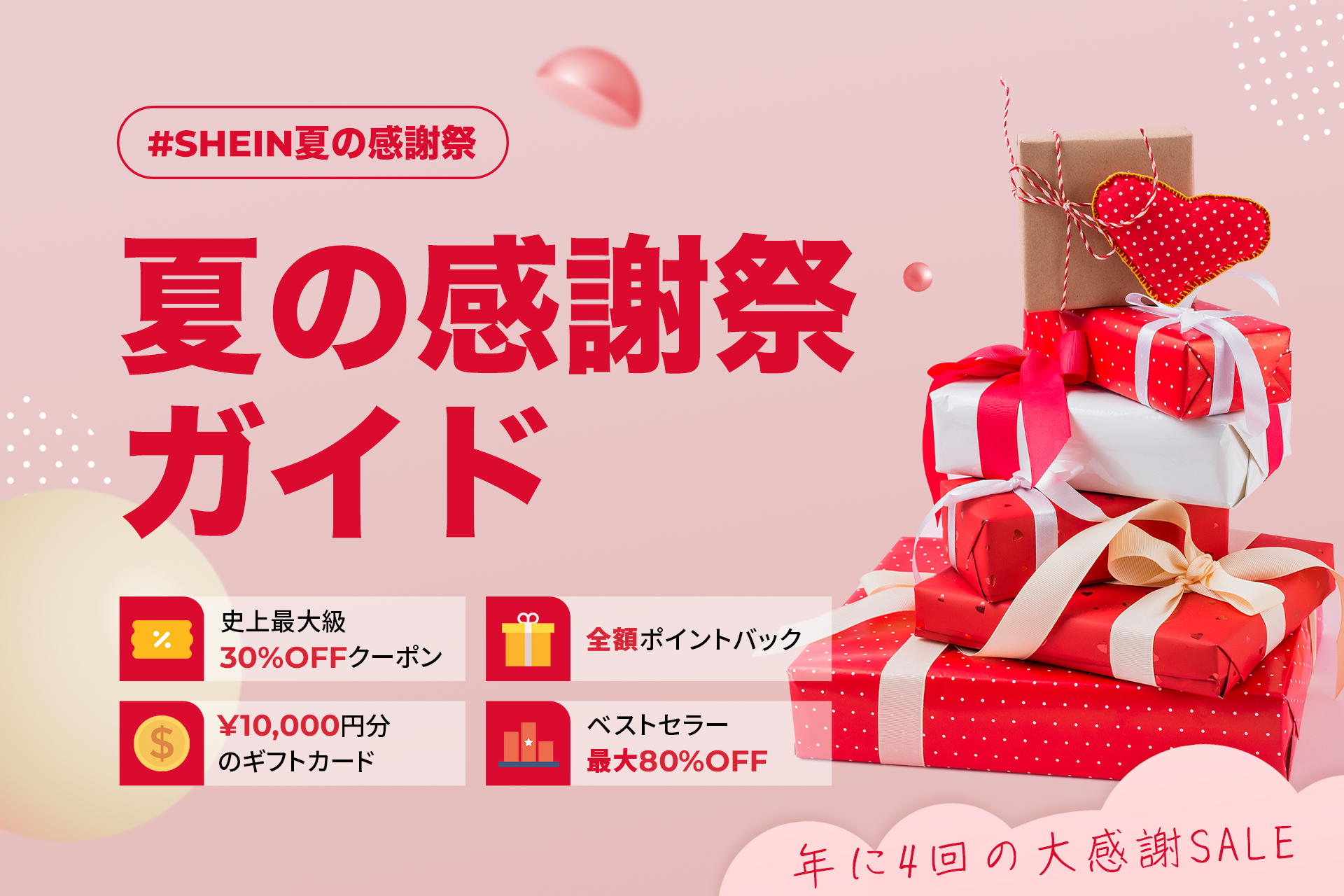 この度「SHEIN」は、年に4度のスペシャルセール『#SHEIN夏の感謝祭』を2023年7月24日(月)12:00から8月7日(月)12:00まで開催しております。夏のイベントごとに欠かせないトレンドファッションアイテムをはじめとして、日常生活にも活躍する便利グッズまで幅広くご用意しています。本セール期間中は、電子機器、携帯ケース、生活家電、ホーム用品、美容、健康用品などの人気主要カテゴリがすべてセール対象となり、最大80%オフでお買い求めいただけます。また、ご購入金額にかかわらず、いくらからでも使用いただけるSHEIN史上最大級の30%オフクーポンの配布に加え、100円から購入いただけるメガタイムセールの実施や、10,000円分のギフトカード配布、購入額全額ポイントバックなど、お得なキャンペーンも開催いたします。