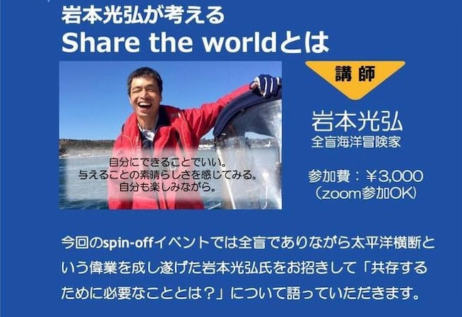 特別ゲストには、全盲でありながら太平洋横断を成し遂げた海洋冒険家の岩本光弘氏をお招きして「共存するために必要なこととは?」をテーマに講演会および懇親会を実施。普段はアメリカ在住である岩本氏が来日する貴重なタイミングに合わせ、フラスコオンラインEXPOの理念でもある”Share the World®”をテーマに、「共存するために必要なこととは?」とのタイトルで講演会を行います。