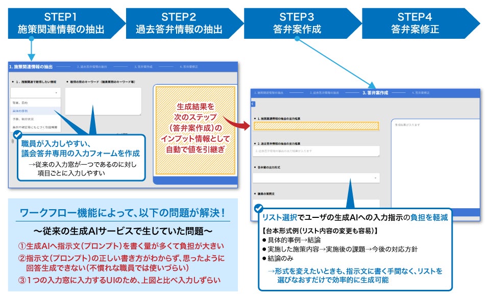✔ 情報検索から答弁案作成/修正までの各ステップの作業を生成AI-ワークフロー機能で完結
