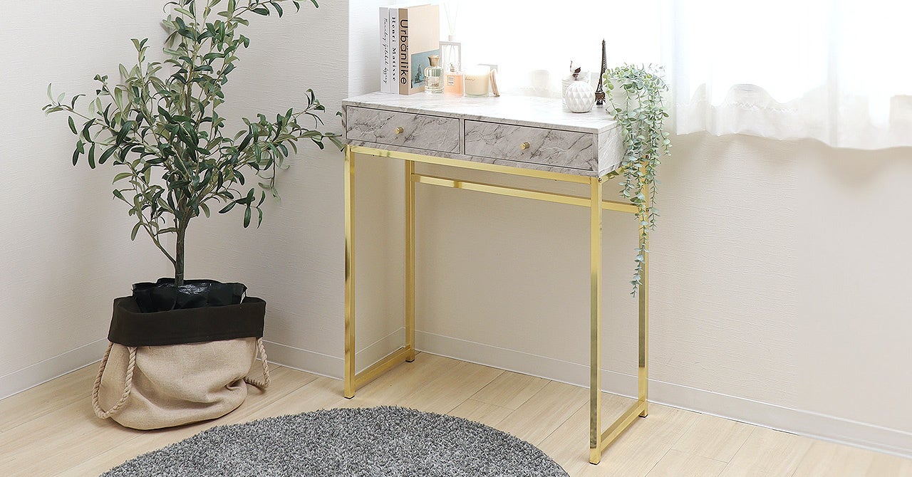 「テーブル」という名前がついていますが、コンソールテーブルはどちらかというと壁を飾るための飾棚としての要素が強い家具です。大きなミラーや絵画などと合わせたおしゃれな風景はホテルのエントランスや高級レストラン、海外ドラマなどでもよく見かけ、非日常的なイメージがあります。今回発売となったヤマソロのコンソールテーブルKulab (クラブ)は、ご自宅でも気軽に使えるコンパクトな幅80cmx奥行32cmサイズ。リビングの一角や窓下など小さなスペースに置いて使うことが出来ます。輝きを抑えたつや消しのゴールド脚と異素材の組み合わせがモダンで、エレガントな印象を放ちインテリア性抜群です。