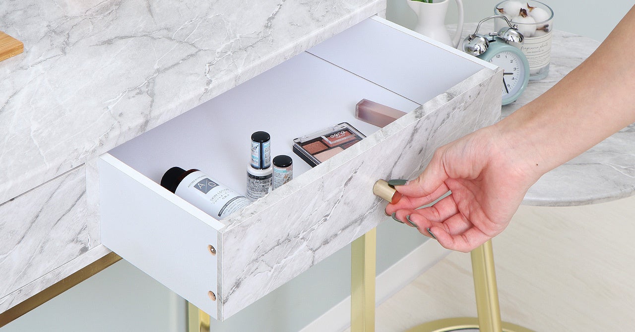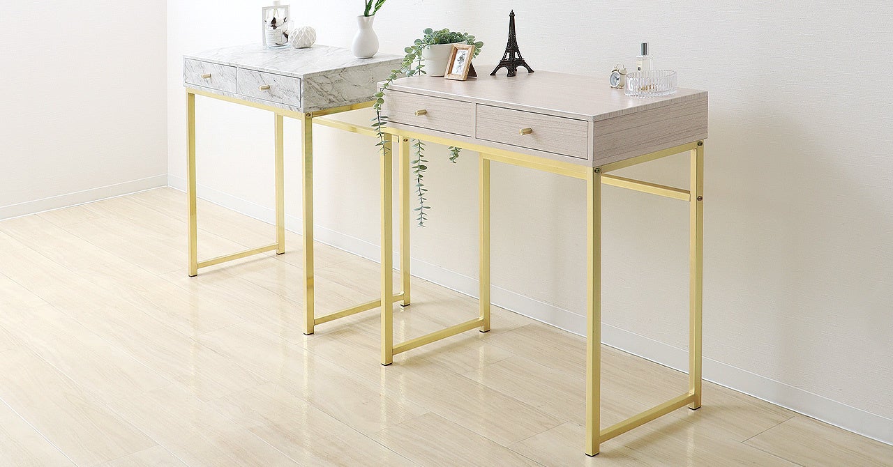 引出しが2つあり、ちょっとした小物など収納できます。天板の高さは81cmとダイニングテーブルより10cmほど高く、デスクチェアと合わせて使えるのでドレッサーとしても。汚れに強いPVCシートを使っているのでお手入れも簡単。キッチンとリビングをつなぐ給仕用のテーブルとしても活躍してくれそう。