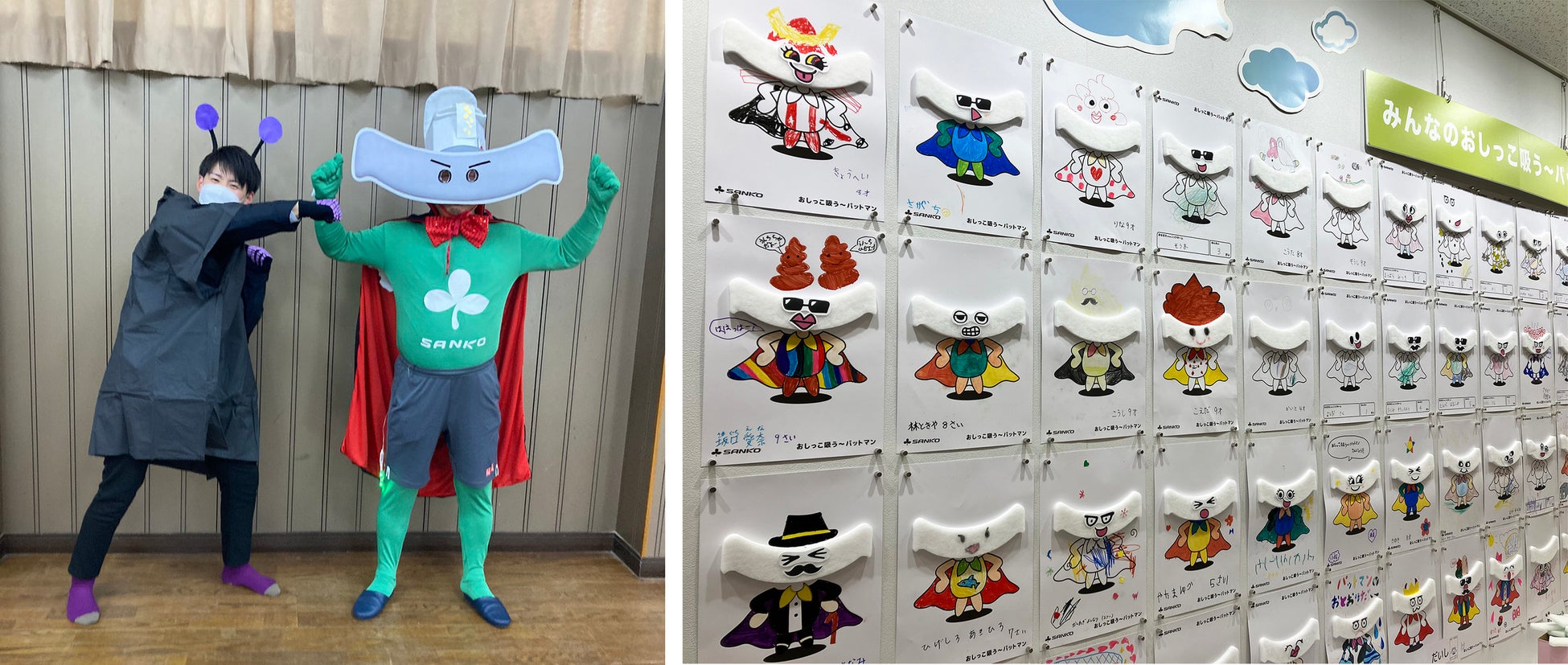 サンコーのトイレ商品人気NO.1の「おしっこ吸う~パット」がキャラクターとなり、和歌山市の幼稚園でトイレについて学ぶクイズを行いました。その他、海南市の図書館にてワークショップを実施しました。
