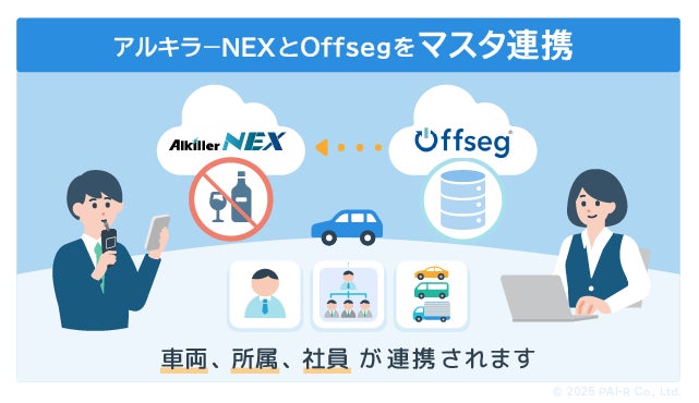 株式会社パイ・アール(本社:大阪市中央区、代表取締役:安田 將佑)は、アルコールチェック管理システム「アルキラーNEX」と、株式会社デンソーテン(本社:兵庫県神戸市、代表取締役社長:米本 宜司)が提供する安全運転管理テレマティクスサービス「Offseg(オフセグ)」との連携を強化し、Offsegのマスタ情報がアルキラーNEXへ自動同期される「マスタ連携」を2025年11月10日より提供開始いたします。