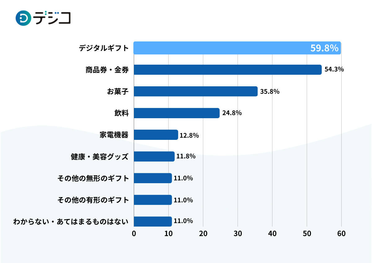 福利厚生やプレゼントキャンペーンなどの販促を実施する際に利用したことがあるものを聞いた結果、59.8%が「デジタルギフト」を利用した経験があると判明しました。次いで「商品券・金券」が54.3%、「お菓子」が35.8%、「飲料」が24.8%でした。