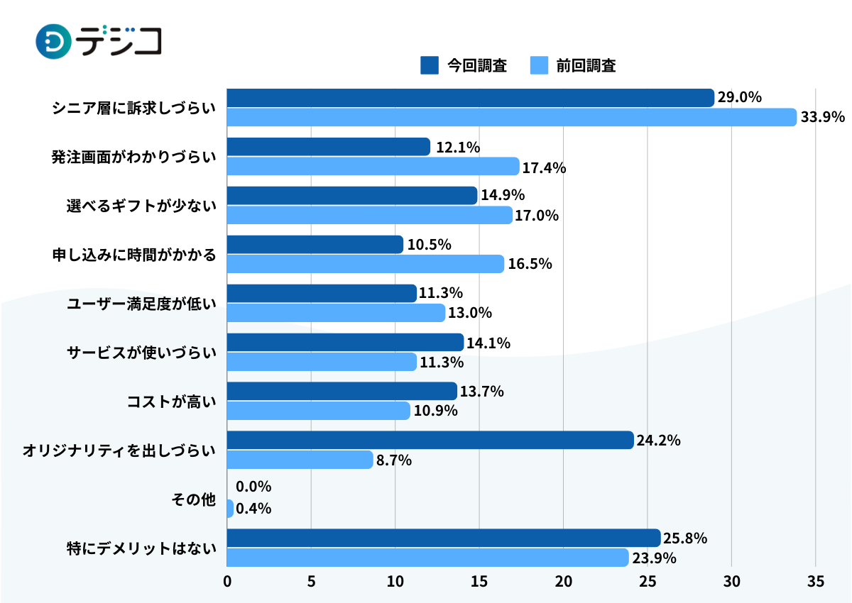 デジタルギフトサービスのデメリットとして29.0%が「シニア層に訴求しづらい」と回答、前回の33.9%よりも改善