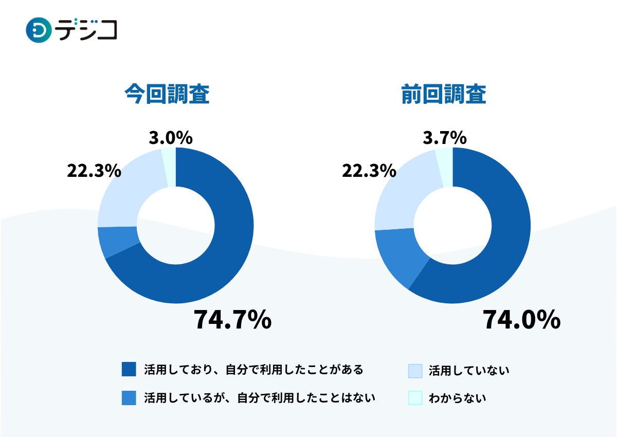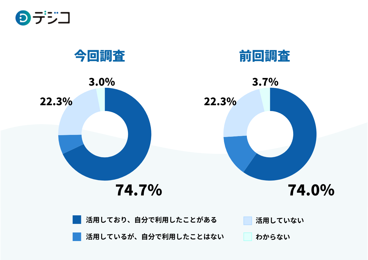 福利厚生としてデジタルギフトを「活用しており、自分で利用したことがある」、「活用しているが、自分で利用したことはない」の合計は74.7%にのぼり、前回の74.0%から少し増える結果になりました。