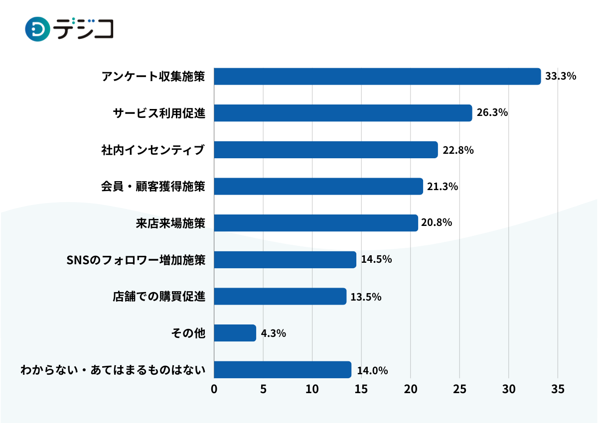 デジタルギフトの活用シーンは「アンケート収集施策」が最も多く33.3%、次いで「サービス利用促進」、「社内インセンティブ」