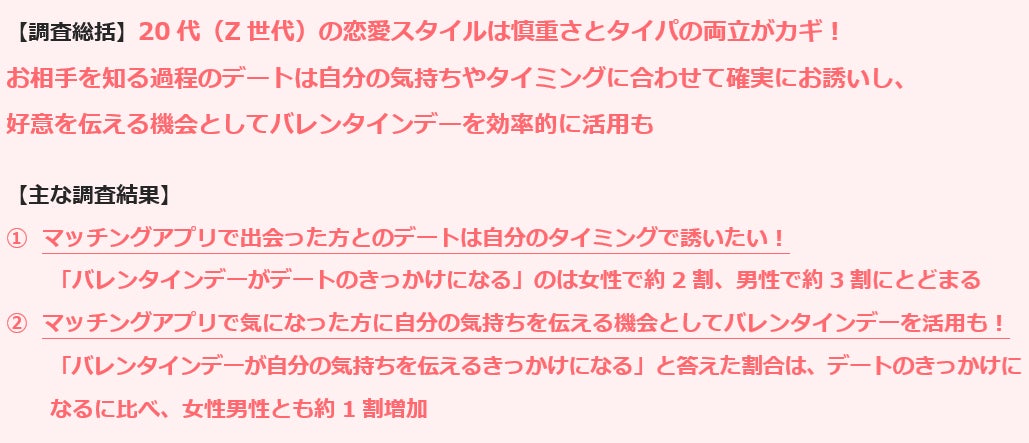 「今や4人に1人がマッチングアプリで結婚する中、利用者数No.1のマッチングアプリ『with』の20代のユーザーの皆さんが、結婚を意識しつつ真面目な出会いを見つけるうえで代表的な恋愛イベントのひとつとされてきたバレンタインデーをどう活用しているのかをひもといてみました。その結果、デートは知り合うためのプロセスで、お互いの距離感を縮めるのに必要と判断した時点でデートをし、その先に好意を伝えたいとなった段階でバレンタインデーの活用を視野に入れるという恋愛スタイルが確認されました。知り合う過程は慎重に臨みつつも、気持ちが固まれば効率性を意識する20代の恋愛スタイルは、事前の情報収集により失敗を回避しながらタイムパフォーマンスにも敏感だと言われるZ世代の行動傾向とも重なります。