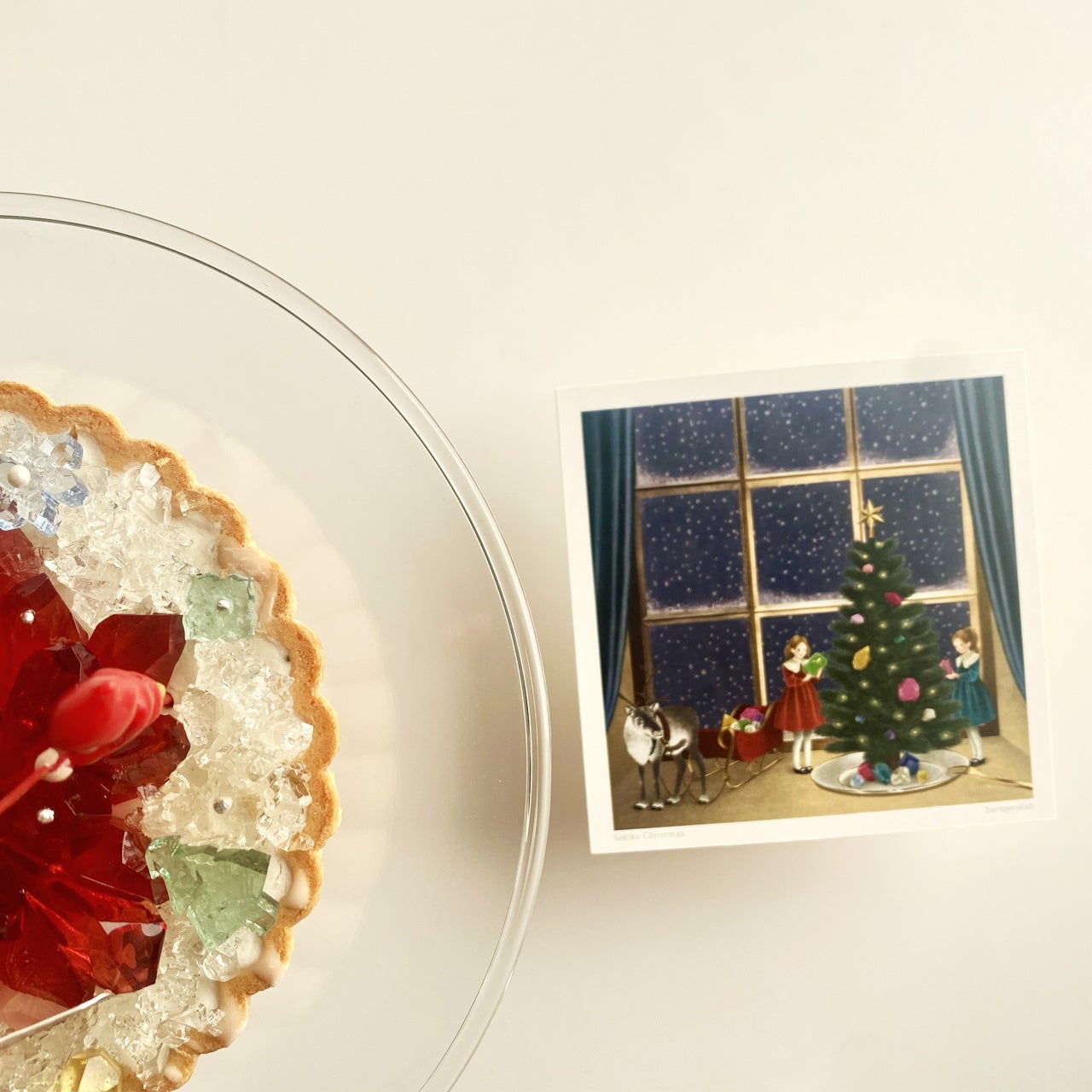 ふわりと冬の夜が深まる季節に、大切な方や家族と一緒にあかりの灯る暖かい家で楽しむ、そんなイメージでご用意した冬限定の宝石のタルトです。シャンパンやワインに合わせて大人の夜のデザートタイムに。コーヒーや紅茶、ハーブティーと合わせて、特別なティータイムの演出に。自分をいたわる夜にも、大切な人へそっと届けたい冬の贈り物にもぴったりです。幻想的な水晶タルトとしても、メルヘンな世界観を楽しむクリスマスケーキとしてもお楽しみいただけるよう、別添のメリークリスマスのプレートとサンタのピックを添えてお届けいたします。