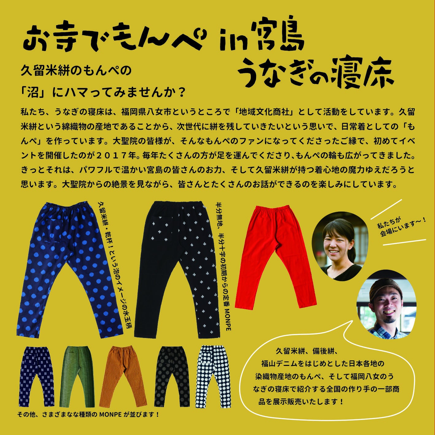 大聖院の皆様が、そんなもんぺのファンになってくださったご縁で、初めてイベントを開催したのが2017年。毎年たくさんの方が足を運んでくださり、もんぺの輪も広がってきました。きっとそれは、パワフルで温かい宮島の皆さんのお力、そして久留米絣が持つ着心地の魔力ゆえだろうと思います。