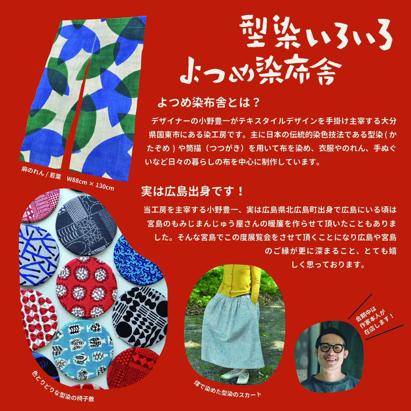 今回のイベント「型染いろいろ」では、椅子敷や暖簾、衣服、手ぬぐいなどの、よつめ染布舎の型染作品を展示販売いたします。実は広島出身という、デザイナーの小野豊一さんも会期中在店しますので、オリジナルのデザインなどの相談も可能です。